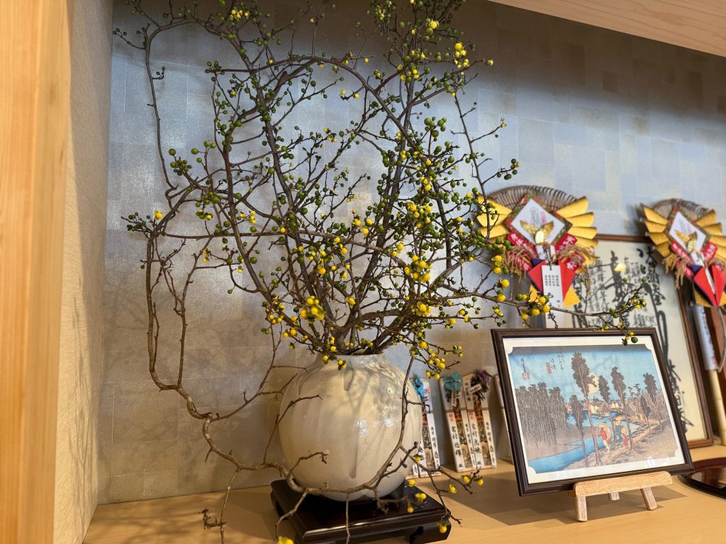 お彼岸を迎えるにあたり、玄関に『ツルウメモドキ』を飾っていただきました。